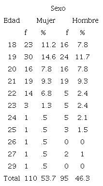 En cuanto a los factores personales biológicos (edad y sexo), la edad de los participantes se ubicó entre los 18 y los 29 años, con una Ẋ = 20.19 (DE= 1.96). Respecto al sexo, predominaron las mujeres con 53.7% tabla 2.