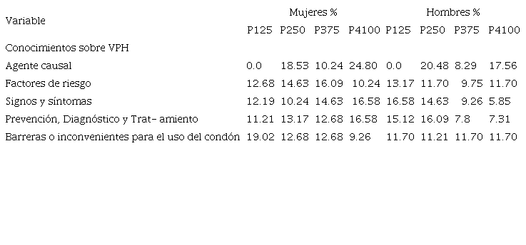 Respecto a la variable de conocimientos sobre el VPH, los hombres presentaron menor nivel de conocimientos a diferencia de las mujeres, esto coincide con los hallazgos obtenidos en estudios previos4,5,9,10,13, aunque el contexto social es diferente al que rodea a los universitarios indígenas.
