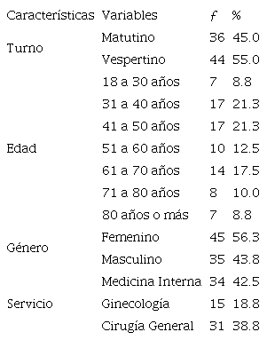 De los 80 pacientes participantes el 55% f=44) correspondió al matutino, el promedio de ellos reportó edades de entre 31 a 40 y de 41 a 50 con un 21.3% (f=17) respectivamente, en cuanto al género predominó al femenino 56.3 (f=45). El servicio con más prevalencia fue medicina interna con 42.5% (f=34) y cirugía general con el 38.8% (f=31) tabla 1.