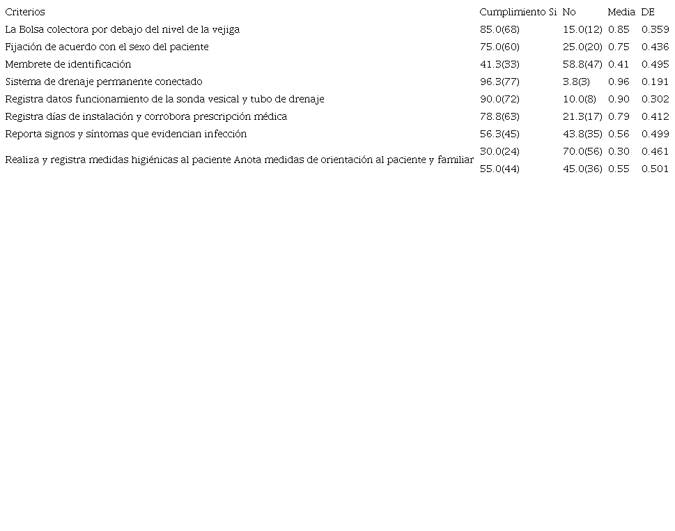 En la tabla 2 se presenta el cumplimiento de los criterios para la prevención de infecciones de vías urinarias en pacientes con sonda vesical instalada, los criterios con mayor porcentaje de cumplimiento fueron “el sistema de drenaje que se encuentra conectado permanentemente” 96.3%(f=77), “registra datos del funcionamiento de la sonda vesical y tubo de drenaje” 90%(f=72), “la bolsa se encuentra por debajo del nivel de la vejiga” 85%(f=68), “registra días de instalación y corrobora prescripción médica” 78.8%(f=63) y “la fijación esta de acuerdo al sexo del paciente” 75%(f=60).