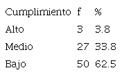 El cuanto el cumplimiento de este indicador fue bajo 62.5% (f=50), debido a que se identificó en la semaforización del sistema de calidad INDICA que se encuentra en semáforo rojo (no cumple) equivalente a <70 y solamente 3.8% (f=3) en verde(estándar) alto cumplimiento tabla 3.