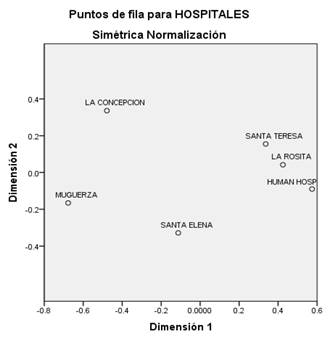 Como se observa en el mapa, cada hospital tiene una distancia significativa; esto quiere decir que cada centro hospitalario se posiciona mediante sus atributos. Por un lado se observa al centro Hospitalario La Concepción, con una distancia lejana de los demás hospitales, porque las cualidades que subyacen a su posición son realmente distintas a las demás. Se observa que el Human Hospital y Hospital La Rosita, tienen una distancia ligeramente cerca con la Clínica Santa Teresa, debido a que estos tres Hospitales tienen atributos en común que los hace percibir así, como en el caso de los precios, instalaciones y equipos. Por otro lado, Clínica Santa Elena