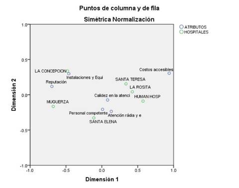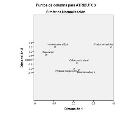 En el mapa perceptual figura 1 se aprecia como los Hospitales del sector privado, son percibidos por los usuarios potenciales, con base en los atributos que poseen cada uno de estos centros que brindan servicios de salud.