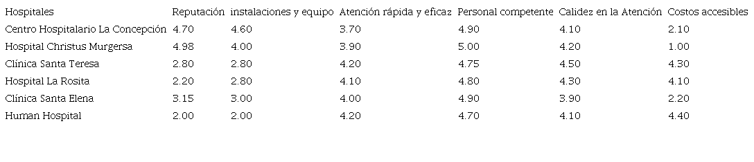En la tabla 2 se muestra los seis atributos utilizados para medir el posicionamiento de los Hospitales particulares en Saltillo. Se puede apreciar el primer atributo que fue Reputación donde el hospital Christus Muguerza es el mejor posicionado con una calificación de excelencia de 4.98; en segundo lugar Centro Hospitalario la Concepción con 4.70, siguiendo Clínica Santa Elena con 3.15, después la Clínica Santa Teresa con 2.80; el Hospital La Rosita con 2.20; por último el menos reconocido por los entrevistados es el Human Hospital con 2.00.