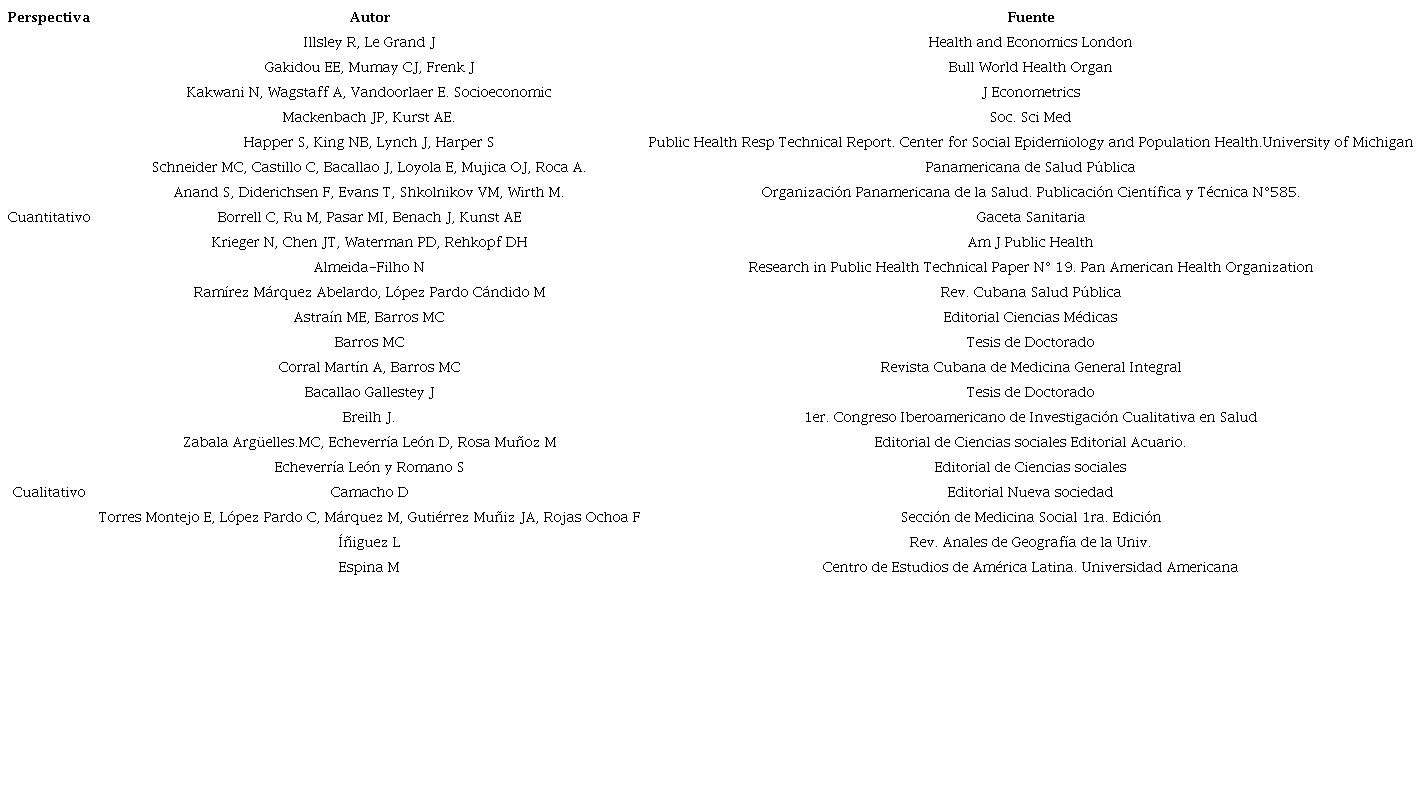 Results: From the quantitative point of view, the incorporation in his analyzes of racial approaches, of educational differences, of socioeconomic groups is distinguished. A group of researchers from the Faculty of Public Health -current Ensap- develop studies that classify the country into three strata of living conditions - favorable, moderately favorable and unfavorable-, starting point these for other research. The qualitative approach is linked to the notions of equality and social justice in terms of real opportunities. This is sustained from the interpretative social point of view and with a comprehensive epistemological perspective.
