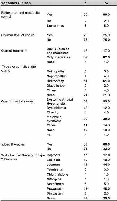 With regard to comorbidities, arterial hypertension was present by a 39.0% of patients; using treatments added to DT2 68%, none of them 29.0%, pravastatin 18.0%, captopril 17.0%, among other antihypertensive drugs. (Table 3).
