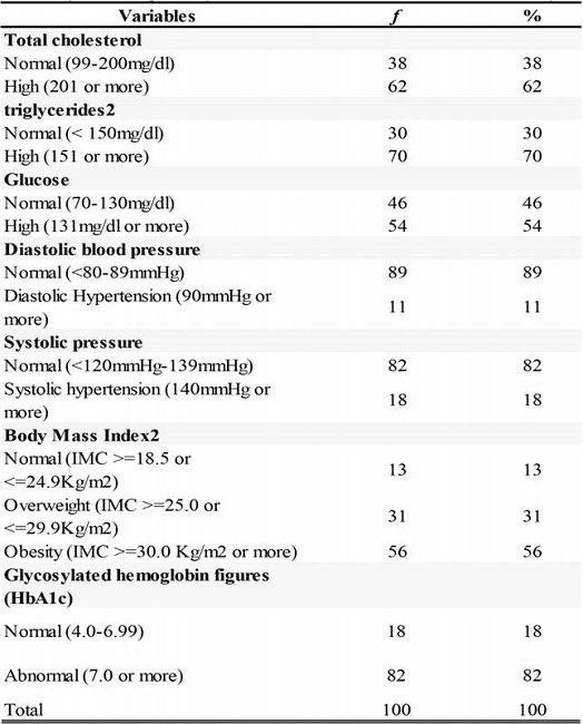 The median of the triglycerides figure was T = 188.33mgs / dl, ds ± 78.530mgs / dl, having a minimum value of 71mgs / dl and a maximum of 652mgs / dl, with a range of 581mgs / dl, a median of 169.0mgs / dl and a mode of 150.0mgs / dl. The median of the systolic blood pressure figure was T = 121.84mmHg, ds ± 13,848 mmHg, minimum value of 90mmHg and a maximum of 160mmHg, with a range of 70mmHg, a median of 120.0mmHg, and a mode of 120.0mmHg. The median of the diastolic blood pressure figure was T = 76.09mmHg, ds ± 8.567mmHg, having a minimum value of 60mmHg and a maximum of 90mmHg, with a range of 30mmHg, a median of 80.0mmHg and a mode of 80.0mmHg.