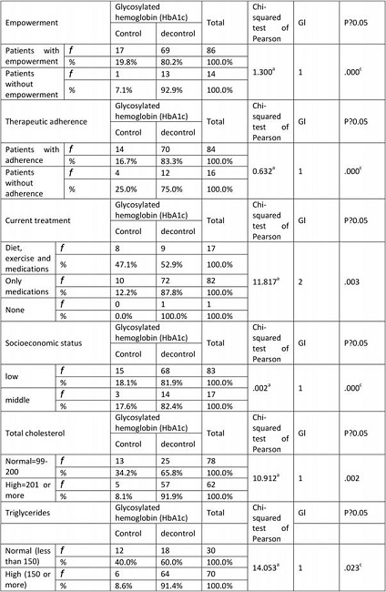 Materials and methods: Observational, cross-sectional and analytical study in a sample of 100 patients with diabetes. We analyzed variables of perception of empowerment, therapeutic adherence, sociodemographic and clinical. As a dependent variable, the figure of glycosylated hemoglobin HgAlc was taken as the gold standard of metabolic control. An instrument integrated by the DES-28 scale was applied to assess perception of empowerment, a questionnaire to assess the perception of Adherence of Bayarre-Grau. For the analysis, descriptive and inferential statistics (Pearson’s X2) were used with the SPSS V22.0 software.