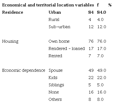 According to the place of origin, most patients are from urban area and they are represented by an 84.0%; patients that live in their own home 76.0%, depend on their spouse economically 49.0%, live with a relative 76.0% and live on their own 16.0%. (Table 2)