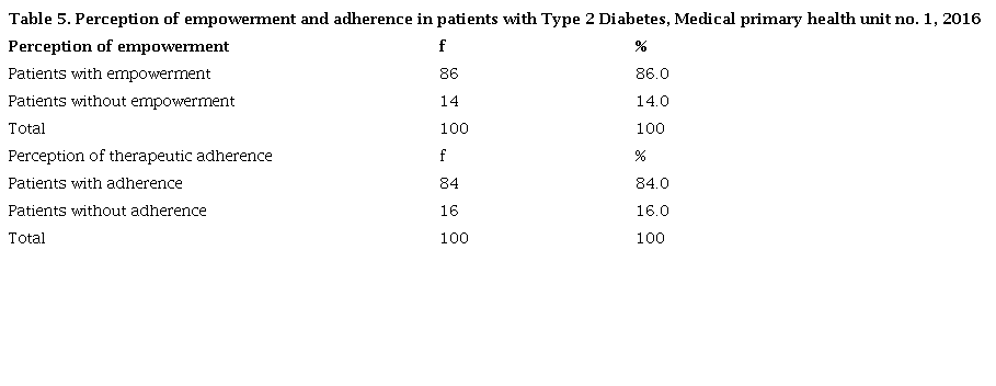 The patient’s perception of empowerment related to the control of their disease is 86%. The literature consulted reveals that empowerment is related to a better knowledge of diabetes, better adherence and better self-care behaviors. We will have to work with more effective strategies for empowerment to be achieved, such as making a paradigm shift, moving from traditional care to patient-centered care, without neglecting aspects such as the gender approach in health, in this field there is still a significant lag of men who do not demand health care in the same proportion as women. Dominguez Mont points out in his study that “While the tasks of care are considered primarily feminine ... the de-modernization of health care practices will be little visible”. Although the instrument explores the perception of compliance with the therapy in the patient, it fails to measure in more depth determining factors such as type of diet, physical activity and other aspects related to their control, which could be causing the observed levels of glycosylated hemoglobin and other abnormal metabolic control variables. Investigating other factors and implement empowerment strategies are opportunities to achieve successful outcomes.