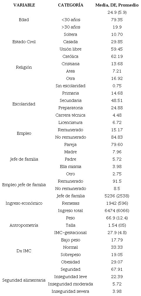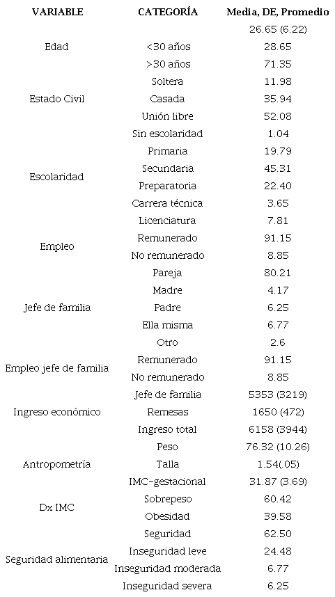 Resultados: La cohorte estuvo conformada por 402 mujeres embarazadas en 2017. De los resultados principales encontramos que el 55% de las mujeres se encontraba en el rango de edad de 18-24 años; el 15% de las mujeres refirió contar con un empleo remunerado; el 42% de la población tenía secundaria completa; el 32.1% presentó un grado de inseguridad alimentaria; la media de IMC fue de 27.8±4.8, el 48% de las mujeres presentaron sobrepeso y obesidad.
