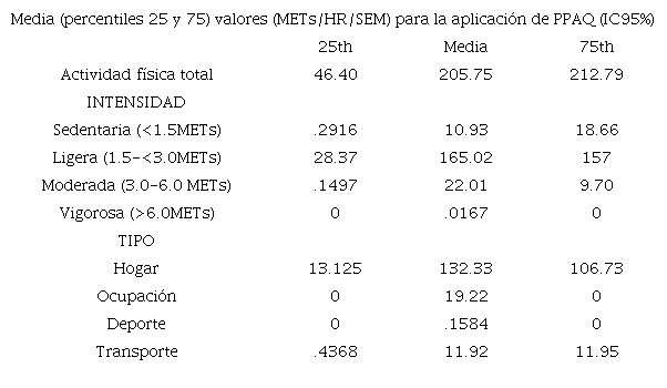 El análisis del cuestionario PPAQ (por sus siglas en inglés), clasificó la actividad física por intensidad (sedentaria, ligera, moderada y vigorosa) y por tipo (Actividad del hogar, ocupación, transporte y deporte).