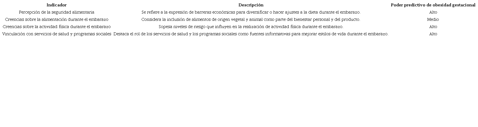 Respecto al indicador de creencias sobre la alimentación durante el embarazo, se reportaron situaciones relacionadas con la inclusión y exclusión de alimentos y bebidas durante el embarazo. Algunos factores facilitadores reportados fueron la disponibilidad y accesibilidad a frutas y verduras, sea mediante el apoyo familiar, o bien por su oferta a bajo precio en el vecindario. Llamó la atención la referencia a la exclusión de bebidas alcohólicas, así como sodas y otras bebidas industrializadas. Se asignó poder predictivo medio a este indicador debido a que se refirió la ingesta de otras bebidas con alto contenido calórico como el atole (preparado de maíz con chocolate, frutas y azúcar). Asimismo, no obstante que se expresó la relevancia de evitar el consumo de alimentos ultraprocesados, las informantes expresaron el consumo frecuente de estos productos.