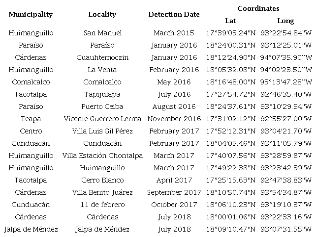 The first records of Ae. albopictus in Mexico were conducted in the state of Tamaulipas 19887, Coahuila in 19948,9, later in 19948,9 the first infested states in the Gulf of Mexico Veracruz10, and Nuevo León 200111. In September 2003, larvae samples in Tapachula, Chiapas12. The species was reported in the southern center of the countiy in Morelos13. In 2012, the presence of the species was confirmed in Cancún, Quintana Roo14. Currently, Ae. albopictus is registered in 12 states of Mexico (Chiapas, Coahuila, Hidalgo, Morelos, Nuevo León, Oaxaca, Puebla, Querétaro, Quintana Roo, San Luis Potosí, Tamaulipas and Veracruz)15. Recently the first record of Ae. albopictus in Tabasco reported in June 2018 in the Municipalities of Huimanguillo, Teapa, Tacotalpa and Villahermosa16.