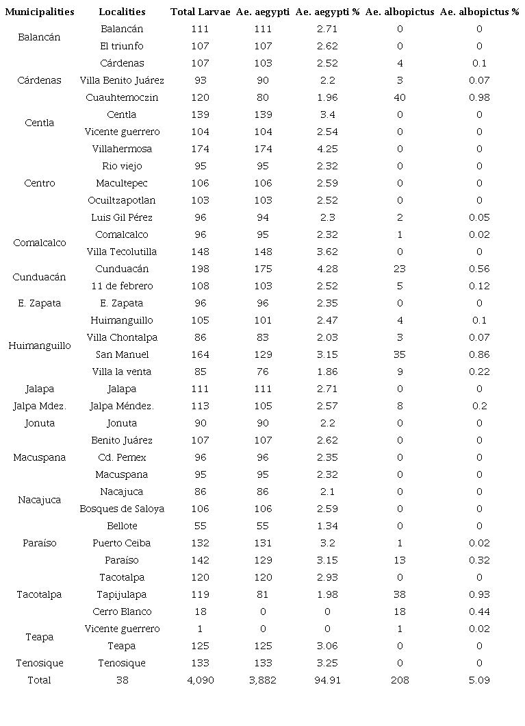 Results: Of the samples collected, 3,882 (94.91%) corresponded to Aedes aegypti and 208 (5.08%) to Aedes albopictus. The distribution of Aedes albopictus was identified in 9 municipalities representing 52.94% of affected municipalities with the presence of the vector and corresponds to 44.74% of localities sampled positive in the state of Tabasco.