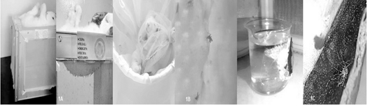 Se evaluaron tres diferentes fuentes sanguíneas: conejo Nueva Zelanda (Oryctolagus cuniculus) figura 1A, rata egipcia (Rattus norvegicus) figura 1B y humana, figura 1C. La sangre de conejo y rata se obtuvo de los organismos criados en el bioterio del Centro Regional de Control de Vectores y fue administrada a través de alimentación directa. Los conejos fueron rasurados en la región dorsal y se colocaron en la jaula, en apego a los lineamientos establecidos en la guía operativa insectario6 y con un trato humanitario por parte del personal tomando en consideración la Norma Oficial 062-ZOO-1999, especificaciones técnicas para la producción, cuidado y uso de los animales de laboratorio.8 Las ratas egipcias se inmovilizaron en un saco de tela tricot, exponiéndose dentro de la jaula. En ambos modelos el tiempo de exposición en las jaulas fue de 30 min. La sangre humana se suministró a través de una membrana artificial de algodón impregnada con la sangre y colocada sobre un recipiente con agua a 65°C, colocada dentro de la jaula por un periodo de 30 min.