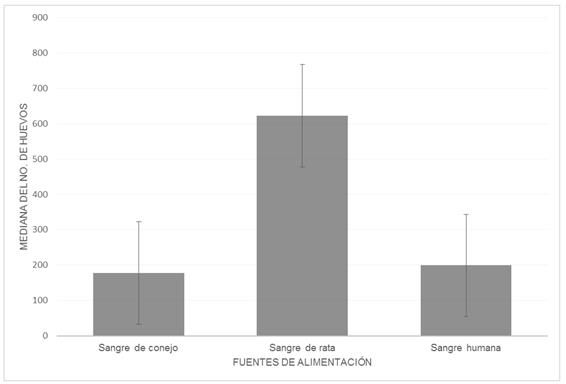 Material y Métodos: Grupo de mosquitos hembra Aedes aegypti con 1 día post-emergencia fueron alimentadas en condiciones de insectario con tres diferentes fuentes sanguíneas. Los grupos alimentados con conejo Nueva Zelanda y rata egipcia se expusieron de forma directa dentro de las jaulas de emergencia con los mosquitos; y en los grupos de mosquitos alimentados con la fuente sanguínea humana se utilizó una membrana artificial de algodón. Los datos fueron analizados con una prueba no paramétrica de Kruskal-wallis (p ≤ 0.05).