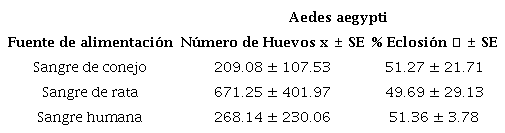 Resultados: Se observó una diferencia estadísticamente significativa en el promedio de huevos colocados entre los tres grupos de hembras Aedes aegypti alimentados con diferentes fuentes sanguíneas: sangre de rata, 671.25 huevos; sangre humana, 268.14 huevos y sangre de conejo, 209.08 huevos (X2= 10.666, P < 0.0048); el porcentaje de larvas eclosionadas no presentó diferencias estadísticamente significativas entre las tres fuentes sanguíneas (X2= 0.192, p < 0.9083).