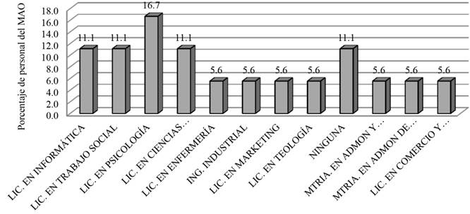 Otro dato de importancia, fue la escolaridad; en esta investigación se identificó que en los MAO de Cárdenas 77.8% de los afiliadores cuenta con estudios superiores, siendo la profesión más frecuente entre estos, la licenciatura en psicología (n = 3), otras ocho profesiones se presentaron en los MAO, además también se encontró afiliadores con estudios de posgrado (11.1%) y otros sin profesión alguna (11.1%), lo que indica, una apertura por parte del REPSS - Tabasco a la contratación de personal sin distinción en este rubro.