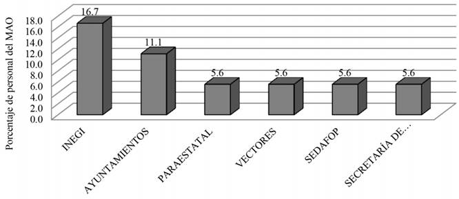 El cumplimiento de lineamientos de contratación, establecidos por la CNPSS (2006), tampoco fue determinante para la aplicación del grado de competencias. 56% de los empleados actuales de los MAO no contaba con experiencia previa y 44% de estos cuentan con nivel intermedio de conocimientos en informática.