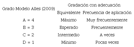 Por lo anterior, la clasificación del nivel de competencia en cuatro grados, se ajustó con su equivalente a la frecuencia de la aplicación con el propósito de no obviar la respuesta del afiliador, como se muestra en la tabla 1.