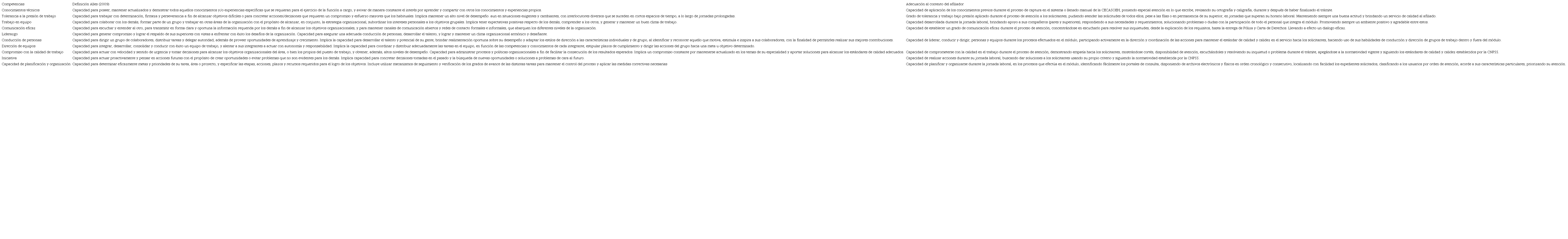 Results: Three types of competences were established (specific by area, cardinal, specific management) which eight competences were grouped: technical knowledge, initiative and effective communication, stress tolerance, teamwork, commitment to quality at work, flexibility and adaptability, planning and organizing, and leadership, people management and team management. The global average of degree of application in all the modules was 3.2, the maximum and expected degrees were the most frequent and the intermediate degree was presented in less frequency. The competence that presented the maximum degree of application was the initiative and effective communication.