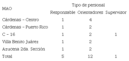 Para el caso de los MAO de Cárdenas, de los 26 sujetos considerados como afiliador por la CNPSS, se aplicaron 18 cuestionarios al personal que realiza tal función, dos de ellos son personal de base y el resto son personal de contrato eventual; se les facilitó el instrumento en una proporción de un responsable por dos orientadores, se incluyen los datos del supervisor de zona, por ser el personal que verifica los procesos efectuados en los MAO y representa al REPSS en su estructura operativa a nivel de MAO.