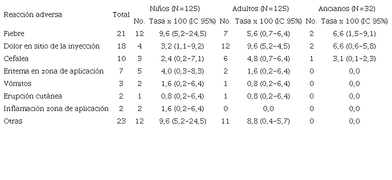 En la Tabla 1 se exponen las reacciones adversas registradas según grupos de edad. La fiebre es más frecuente en niños; en los adultos predomina el dolor en el sitio de inyección.