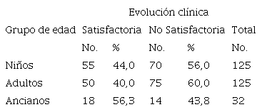 La Tabla 2 muestra que hay más mejoría en ancianos (56,3 %), que en niños (44,0 %) y adultos (40,0 %), aunque no se observan diferencias significativas según los grupos de edad.