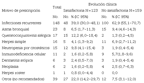 Se detectan diferencias significativas con relación a la evolución clínica cuando los motivos de prescripción son infecciones recurrentes, queratoconjuntivitis alérgica, neutropenia por citostáticos y otros, aunque la mayoría de los intervalos de confianza son muy amplios y poco informativos debido al pequeño número de casos de cada indicación.