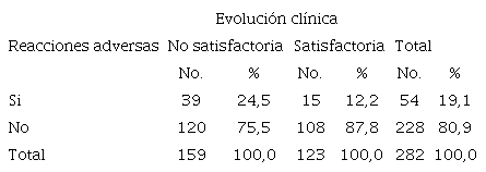 Resultados: Se observó mayor porcentaje de reacciones adversas entre los que evolucionaron de forma no satisfactoria (24,5%), que entre los que evolucionaron bien (12,2%). La diferencia entre beneficio y riesgo favoreció al primero (Factor de Bayes =2,3).