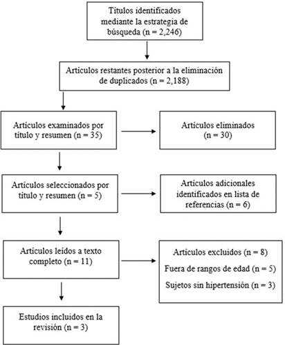 Para la extracción de la información, inicialmente se obtuvieron los registros por cada base de datos, exportándose al archivador bibliográfico Endnote para la eliminación de duplicados. Posteriormente se procedió a la identificación de artículos leyendo el título, consecutivamente se leyó el resumen; en caso de que el artículo se considerase elegible se leyó a texto completo. De los tres manuscritos seleccionados, en solo uno de ellos los pacientes seleccionados tenían HTA diagnosticada y dos presentaban valores de presión arterial elevada.