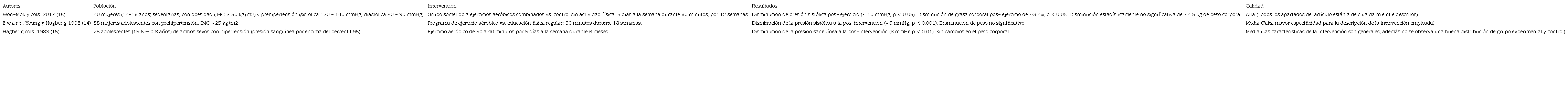 Resultados: Se incluyeron 3 estudios publicados en adolescentes de 14 a 19 años. En dos estudios se aplicaron ejercicio aeróbico con sesiones de 50 minutos diarios durante cuatro y seis meses. En el tercer estudio se combinó ejercicio aeróbico y resistencia muscular con sesiones de 60 minutos, tres días a la semana por tres meses. En las tres intervenciones hubo disminución de valores de presión arterial significativas, sin embargo, la intervención que combinó ejercicio aeróbico y de resistencia muscular, mostró mayor disminución de valores de presión arterial.