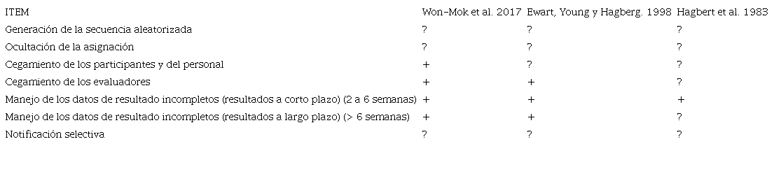 De acuerdo con el grado de calidad tabla 1, dos manuscritos se consideraron de calidad media14,15, mientras que uno fue de calidad alta16. En cuanto al riesgo de sesgo, se clasificaron entre bajo riesgo y riesgo de sesgo no claro tabla 2. Los tres estudios fueron ensayos clínicos aleatorizados.