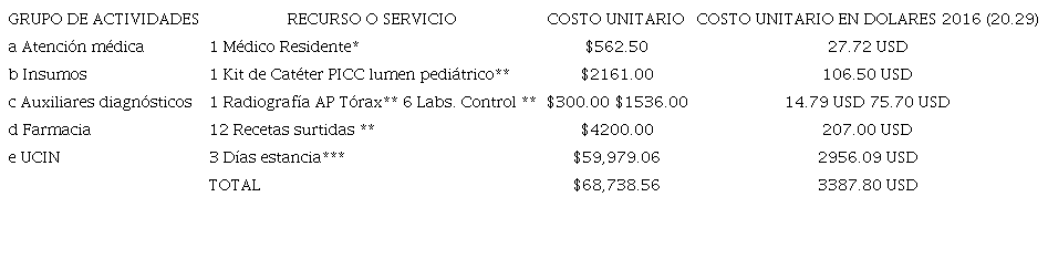 Matériaux et méthodes: Étude de l’analyse des coüts de la relocalisation de cathéter central á insertion périphérique dans l’unité de soins intensifs néonatals dans un hopital tertiaire á Tabasco en 2016. Pour le calcul des coüts un modéle d’établissement des coüts adapté du systéme ABC a été élaboré pour étre applicable dans un hopital : la formule a été conjue: a + b + c + d + e. Pour obtenir le coüt total du repositionnement du PICC; ou a = Coüt du service personnel par procédure pour la réparation du nombre d’événements indésirables X des travailleurs participants, b = entrée nécessaire pour réparer l’événement indésirable, c = Coüt par assistant de diagnostic (USG, Tomographie, X-Ray, Labs.), d = coüt des médicaments et matériel de guérison utilisé par l’événement indésirable, e = Le nombre de jours reste dans l’USIN X coüte D-C-O dans l’USIN.