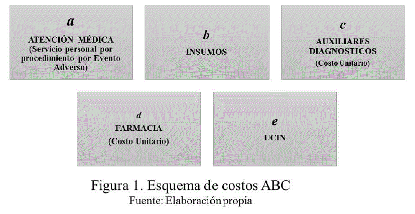 Se entrevistó al jefe de servicio correspondiente para elaborar el flujograma con insumos, tiempo, personal participante a fin de identificar los costos generados durante el procedimiento. Para el cálculo de costos se adaptó un modelo del sistema ABC para ser aplicable en un hospital (Figura 1); identificando causas y elementos presentes en cada proceso. En el área de recursos humanos se calculó el costo directo conformado por el médico residente, enfermera especialista, personal de aseo de la unidad. Para el cálculo de días estancia en la UCIN, se utilizó el programa de costos WINSIG de la Organización Panamericana de la Salud;para las áreas de farmacia, estudios de imagen y gabinete se empleó el Sistema de Información para determinación de costos hospitalarios (SICOSH) vigente al año 2016.