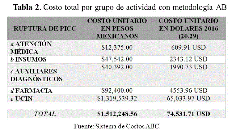 Materiais e métodos: Estudo sobre o custo do recolocação de um cateter central inserido perifericamente na área de cuidados intensivos neonatais de um hospital terciário em Tabasco durante o ano de 2016. Para o cálculo dos custos, foi desenvolvido um modelo de cálculo de custos adaptado do sistema ABC para ser aplicado num hospital; com a seguinte fórmula: a + b + c + d + e. Para obter o custo total do reposicionamento da PICC; onde a = custo com os profissionais de saúde por procedimento para reparar o evento adverso X número de trabalhadores participantes, b = entrada necessária para reparar o evento adverso, c = custo por exame auxiliar de diagnóstico (USG, tomografia, raios-X, laboratórios), d = custo do material e tratamento usado pelo Evento Adverso, e = Número de dias nas UCIN's X custam DCO em UCIN.