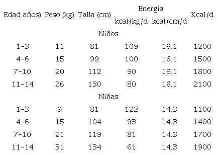 Los requerimientos de energía y nutrimentos dependen más de la talla que del peso. En la tabla 1 se especifican las recomendaciones energéticas de acuerdo a las características de los niños con SD38.