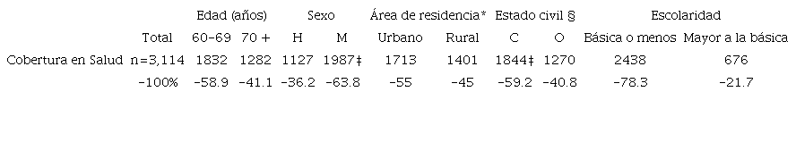 El estudio realizado recabó la información de 3,517 PAMs (60-106 años de edad) residentes de áreas urbanas y rurales de los estados de Hidalgo, Morelos, México, Tlaxcala, Guerrero, Ciudad de México y Guanajuato. Del total de los entrevistados, 3,114 reportó contar con acceso a alguna de las instituciones de seguridad social en salud del país, con lo que se determinó una cobertura en el 88.5% de la población. Al realizar el análisis sociodemográfico, se identificó una mayor cobertura en la población de 60-69 años de edad, observándose una diferencia significativa en las mujeres y en las personas que manifestaron estar casados tabla 1.