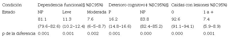 Resultados: Se observó cobertura en el 88.5% de la población. La prevalencia de depresión es del 27.4% y el 96.8% de ellos no recibe tratamiento, además el 18.9% presenta dependencia funcional, el 16.2% deterioro cognoscitivo y el 7.4% ha sufrido al menos una caída con lesiones. Únicamente el 11.2% del total de enfermos fue diagnosticado en su clínica.