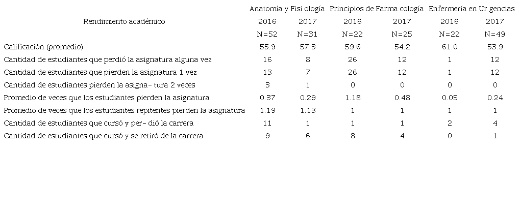 En una escala de 1 a 100 puntos, la media de los estudiantes respecto a sus calificaciones varía en un rango entre 53.9 y 61.0, en todas las asignaturas durante los dos últimos años. Un alto número de estudiantes reprobaron la asignatura la primera vez de cursado, principalmente en la asignatura de Principios de Farmacología, con 26 y 12 alumnos reprobando el año 2016 y 2017, respectivamente, seguido por la asignatura de Anatomía y Fisiología, con 13 y 7 alumnos en cada año. Observándose también el caso de estudiantes que luego de cursar, terminan finalmente perdiendo la carrera, lo cual puede estar asociado a las altas tasas de reprobación de 1 o más veces en estas asignaturas troncales.