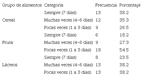 Los resultados de la tabla 2, donde se observa que el consumo diario de fruta y lácteos no llega al 25% y que el consumo de cereales todos los días es inferior al 40%, son similares a los resultados de Amigo y col.24 donde se observó que los estudiantes no tenían una ingesta variada de diversos alimentos, por lo que no se constituía en un desayuno de calidad. Igualmente, en un estudio realizado en Ecuador se observó que los escolares que consumían un desayuno de buena calidad, tenían un rendimiento académico más elevado, en comparación con otros niños que no desayunaban o lo hacían de manera incompleta25.