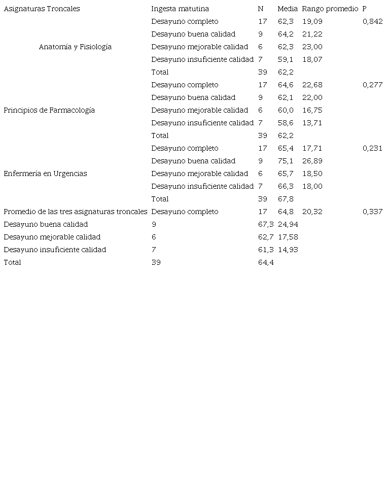 En relación a la posible influencia de la calidad del desayuno sobre el rendimiento académico tabla 3, donde la prueba Kruskal Wallis aplicada a los resultados, no demostró relación entre las variables “Calidad del desayuno” y la media de calificaciones en las diferentes asignaturas (p>0.05), el trabajo de Torres y col.26 presenta resultados similares. En este estudio tampoco se encontró ninguna correlación entre la ingesta de desayuno y el rendimiento académico en estudiantes de Extremadura.
