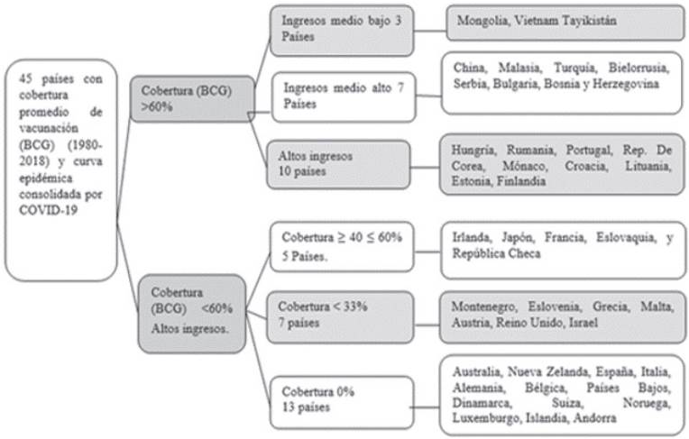 Se trata de un estudio ecológico mixto; del total de países que integran la Organización Mundial de la Salud (OMS) se eligieron aquellos con curva epidémica consolidada, es decir que ya haya transcurrido la primera ola epidémica, cuyo descenso se mantenga horizontal al nivel de fase inicial de la pandemia por COVID-19. Curva actualizada al 1 de junio 202026,27así como haber transcurrido al menos 3 meses entre el reporte de los primeros casos y su consolidación. Además, contaran estos países con información de coberturas de vacunación con bacilos Calmette-Guérin (BCG) tomada de base de datos de vacunación 1980-2018 Estimates of National Immunization Coverage28, ambas fuentes de la Organización Mundial de la Salud (OMS).