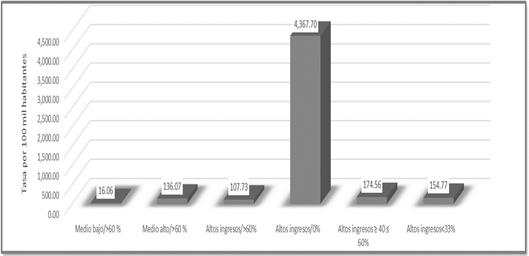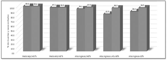 Ahora bien, sí a estos 13 países con altos ingresos y cero coberturas de vacunación con BCG, se les hubiera vacunado con coberturas de 79.7% (grupo de países con mejor cobertura) en el periodo señalado, la mortalidad posiblemente se hubiese reducido 912.061 por 106(p<0.01) habitantes, incidencia 4,231.627 por 105 (p<0.01) habitantes. También probablemente se podrían haber evitado 97.153%(p<0.01) muertes y 96.885 % (p<0.01) de casos en población vacunada.