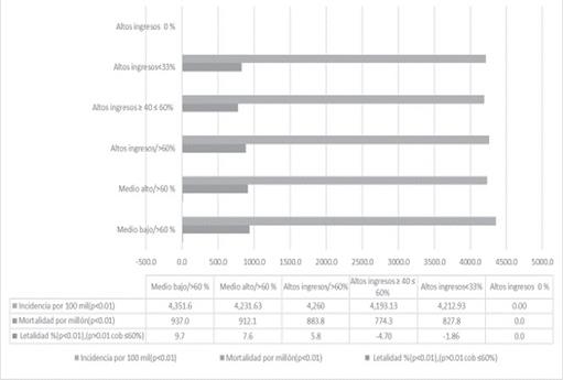 Contraste que se mantuvo, aunque de menor magnitud en el grupo de países con coberturas igual o menor al 60%, excepto para la letalidad que tuvo comportamiento similar. Diferencias más amplias de estos indicadores que las reportadas por otros autores en pleno epicentro de la pandemia19,20,21.22.23.