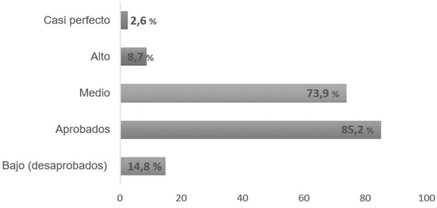 En general, aprobaron la evaluación de conocimiento del diagnóstico de asma 85.2% de los profesionales encuestados (n=98), 73.9% alcanzaron un nivel medio figuras 1.