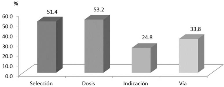 Los parámetros de prescripción contemplados como se observa en la figura 3, fueron de selección, dosis, indicación y vía de administración, aunque el menor peso en la medición de conocimientos fue el relacionado con la dosis, pues solo hubo un reactivo para medir este parámetro, así la tasa de error alcanzó 53.3 x 100 profesionales encuestados, pero no es comparable con los demás parámetros.