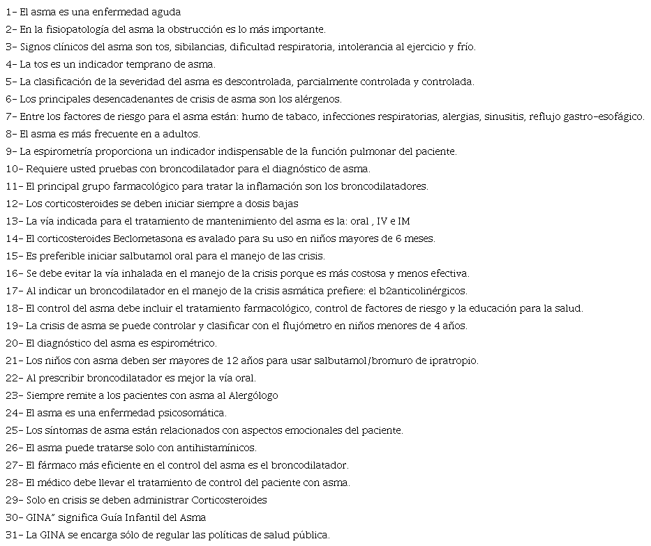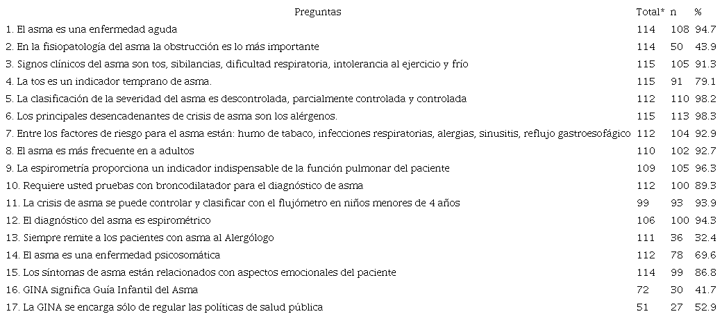 Conclusion.: There is a medium knowledge about the diagnosis of asthma and low knowledge about treatment, mainly in the selection and route of administration of the drug.