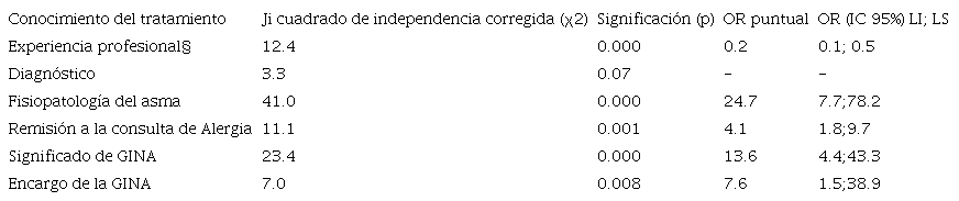 La evaluación del conocimiento del tratamiento del asma (aprobado y desaprobado) fue independiente de la evaluación del conocimiento del diagnóstico (aprobado y desaprobado) dado p>0,05. Sin embargo, el análisis independiente de cada uno de los aspectos deficientes en el conocimiento sobre el diagnóstico de asma arrojó un OR>1, lo que significó que el pobre conocimiento de la fisiopatología del asma, el significado y encargo de la GINA; así como de la remisión a la consulta especializada, influyeron en el conocimiento del tratamiento del asma.